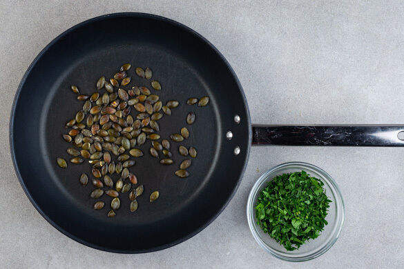 Die Kürbiskerne in einer mittelgroßen Pfanne ohne Zugabe von Fett bei mittlerer Hitze 2–4Min. anrösten, bis sie knistern und goldbraun sind. Zum Abkühlen aus der Pfanne nehmen, anschließend grob hacken. Die Pfanne aufbewahren. Die Petersilie samt Stängeln fein schneiden.