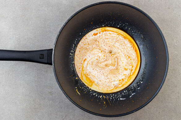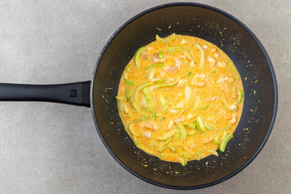 Die Gewürzpaste in einem Wok oder einer großen Pfanne mit 1EL Pflanzenöl bei mittlerer Hitze in 1–2Min. duftend anbraten. Dann die Kokosmilch und 100ml Wasser zugeben.