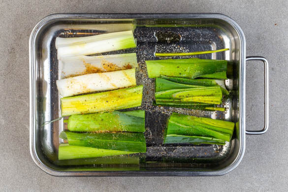 Den Backofen auf 220°C (200°C Umluft) vorheizen. 2EL Butter aus der Kühlung nehmen und Zimmertemperatur annehmen lassen. Den Lauch längs halbieren und in ca. 10cm lange Stücke schneiden. In einer Auflaufform mit 1 Prise Brühgewürz sowie je 1TL Salz und Pfeffer bestreuen und mit 2EL Olivenöl beträufeln. Mit Alufolie abgedeckt ca. 30Min. im Ofen backen, bis der Lauch weich ist.