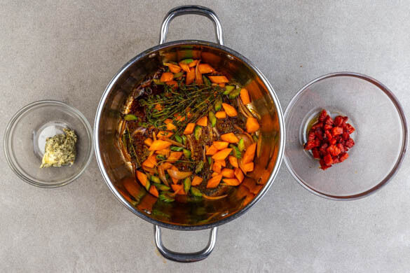 Die Chorizo in einem großen Topf bei mittlerer Hitze in 2–4Min. leicht knusprig anbraten, ggf. 1–2TL Öl zugeben. Aus dem Topf nehmen und abgedeckt beiseitestellen. Die Karotten, den Sellerie, die Schalotten und den Thymian in dem Topf mit 2EL Olivenöl 3–5Min. braten, bis die Schalotten glasig sind. Die bereitgestellte Butter mit der Gewürzmischung verrühren.