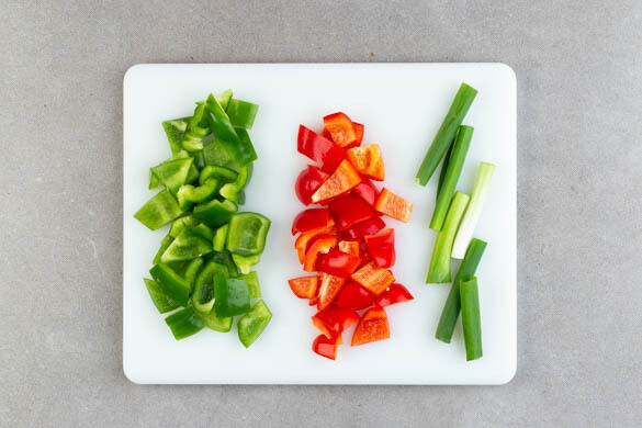 Während der Blumenkohl röstet, die Paprika vierteln, entkernen und in große Stücke schneiden. Die Lauchzwiebeln in je 6 lange Stücke schneiden. Die Peperoni in feine Ringe schneiden.