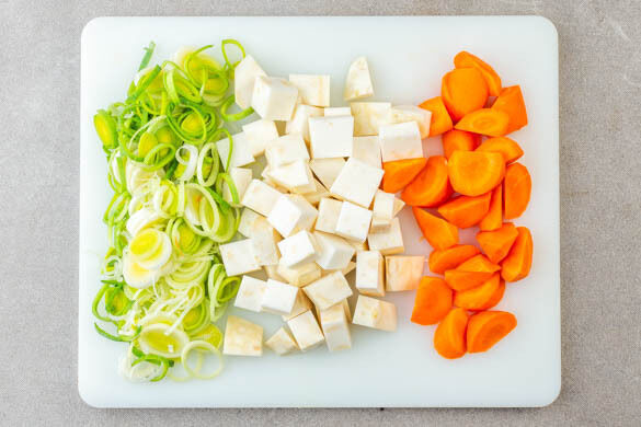 Den Sellerie jeweils vierteln, schälen und in ca. 2cm große Würfel schneiden. Die Karotten ggf. schälen und ebenfalls in ca. 2cm große Würfel schneiden. Den Lauch in dünne Ringe schneiden.