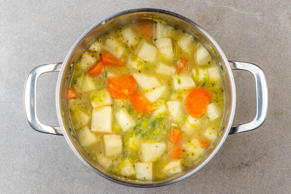 Den Sellerie, die Karotten und den Lauch in einem großen Topf mit 2EL Butter bei mittlerer Hitze unter gelegentlichem Rühren 4–6Min. braten, bis das Gemüse weich wird.