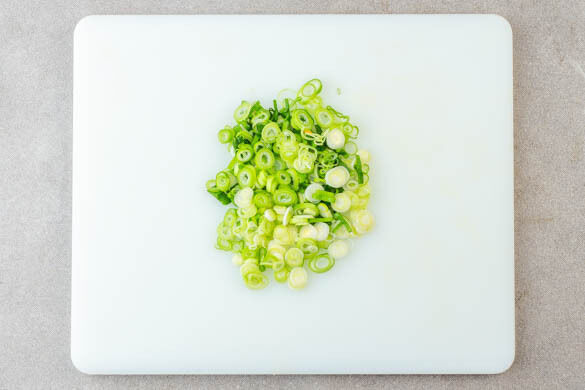 Die Lauchzwiebeln in feine Ringe schneiden.