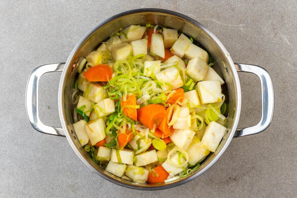 Den Sellerie vierteln, schälen und in ca. 2cm große Würfel schneiden. Die Karotte ggf. schälen und ebenfalls in ca. 2cm große Würfel schneiden. Den Lauch in dünne Ringe schneiden.