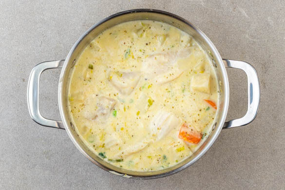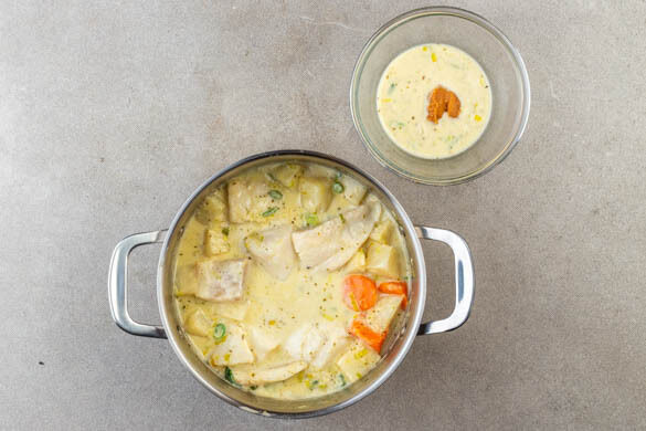 Den Fisch kalt abspülen, trocken tupfen und evtl. vorhandene Gräten mit einer Pinzette entfernen. Den Fisch in ca. 3cm große Stücke schneiden und von beiden Seiten mit 1 Prise Salz würzen. Die ½ der Sahne und die ½ der Lauchzwiebeln in den Eintopf einrühren. Wenn der Eintopf wieder simmert, den Fisch zugeben und ca. 5Min. sanft köcheln, bis er gerade gar ist.