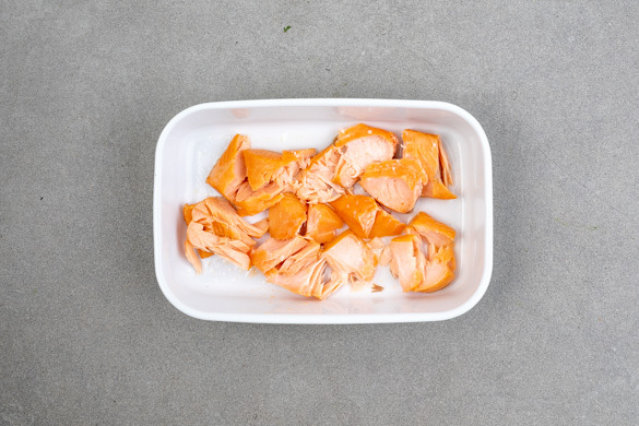 Die Haut entfernen und den Lachs mit einer Gabel grob zerteilen, evtl. vorhandene Gräten mit einer Pinzette entfernen. Den Fisch in eine kleine Auflaufform geben, etwas Kochwasser darüberträufeln und bis zum Servieren im Ofen erwärmen.