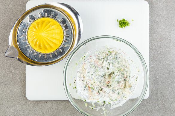 Die Limettenschale abreiben, dann die Limette halbieren und auspressen. Den Joghurt mit den Gurken- und den Apfelraspeln, 1TL Limettensaft sowie 2TL Minze verrühren. Die Raita mit Salz und Pfeffer abschmecken.