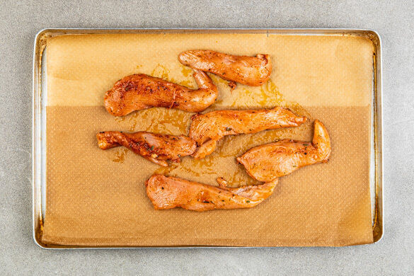 Das Fleisch trocken tupfen und längs in ca. 2cm breite Streifen schneiden. Auf einem mit Backpapier ausgelegten Backblech mit 1EL Zitronensaft, der Gewürzmischung, 1EL Olivenöl sowie je 1 Prise Salz und Pfeffer vermengen. Das Fleisch im Ofen 8–10Min. backen, bis es gar ist.
