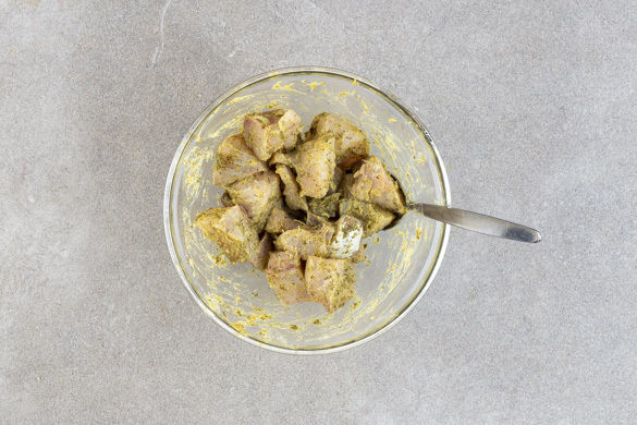 Den Backofen auf 220°C Umluft (240°C Ober-/Unterhitze) vorheizen. Den Fisch mit etwas Küchenkrepp trocken tupfen und evtl. vorhandene Gräten mit einer Pinzette entfernen. Anschließend in 1–2cm große Stücke schneiden und mit 1/2TL Fischgewürz sowie dem Senf vermengen.