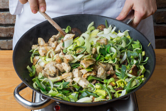 Die Pilze in der Pfanne mit 1EL Olivenöl bei starker Hitze 2–3Min. anbraten. Den Lauch und das Fleisch untermengen. Die Crème fraîche und die ½ des Brühgewürzes oder nach Geschmack mehr einrühren und alles 3–4Min. sanft köcheln lassen. Mit Salz und Pfeffer abschmecken.