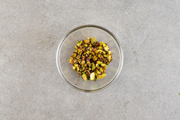 Die Pistazien und die ½ des Kreuzkümmels in einer kleinen Pfanne bei mittlerer Hitze 2–3Min. anrösten. Tipp: Wer mag, kann auch mehr Kreuzkümmel verwenden. Dabei regelmäßig rühren, damit nichts anbrennt. Aus der Pfanne nehmen, mit 1TL Olivenöl beträufeln und grob hacken. Mit je 1 Prise Salz und Pfeffer würzen.