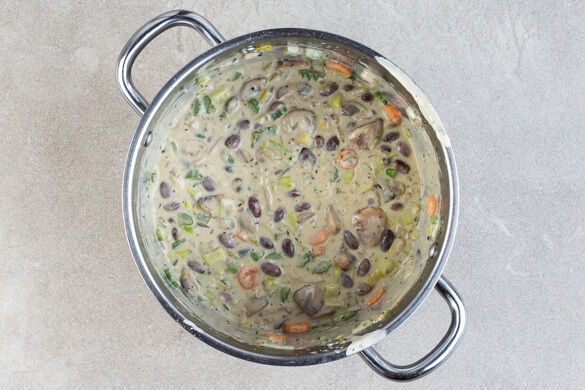 Die Pilze, die Karotten und den Lauch in einem großen Topf mit 1EL Olivenöl und der Gewürzmischung bei mittlerer Hitze abgedeckt 3–4Min. garen, bis das Gemüse weich wird. Die Bohnen zugeben, nach Geschmack mit Salz und Pfeffer würzen und 2EL Mehl unterrühren.
