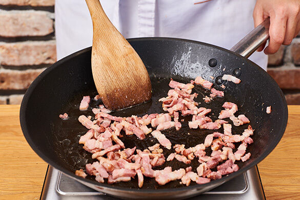 Den Speck in einer mittelgroßen Pfanne bei mittlerer Hitze ohne Zugabe von Fett ca. 5Min. knusprig braten. Auf etwas Küchenkrepp abtropfen lassen. Die Pfanne auswischen.