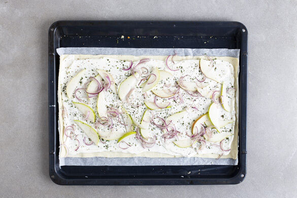 Die Teige mit dem Papier nach unten auf zwei Backblechen ausrollen, gleichmäßig mit der Creme bestreichen und mit dem Rosmarin sowie 1 Prise Pfeffer bestreuen. Darauf die Birnen und die Zwiebelstreifen verteilen und die Flammkuchen in 12–15Min. im Ofen goldbraun und knusprig backen. Je nach Ofen die Position der Bleche nach der Hälfte der Zeit tauschen.