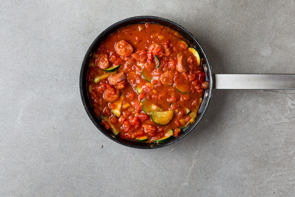 Die gehackten Tomaten und das Brühgewürz in die Pfanne geben und gut unterrühren. Einmal aufkochen und anschließend ca. 5Min. sanft köcheln lassen.