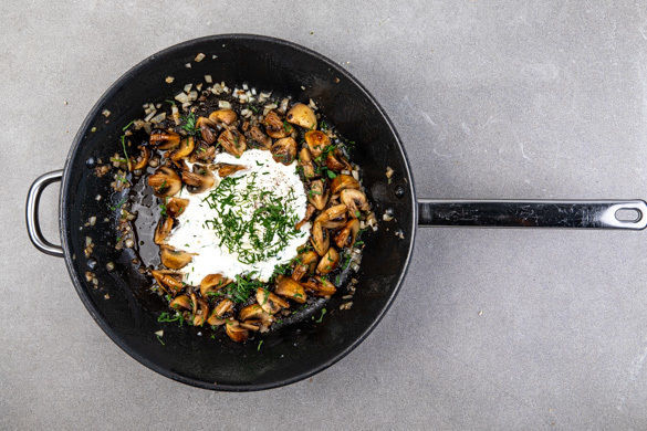 Die Pilze in derselben Pfanne mit 1EL Olivenöl bei starker Hitze 2–3Min. anbraten. Die restlichen Zwiebeln dazugeben und 1Min. mitbraten. Die Crème fraîche und die Petersilie unterrühren und mit Salz und Pfeffer würzen. Die Brötchen mit dem restlichen Senf nach Geschmack bestreichen und mit den Pattys und der Pilzsauce belegen. Mit dem Gurkensalat servieren.