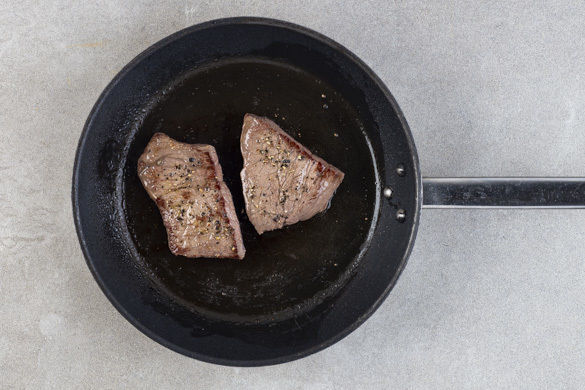 Das Fleisch in einer großen Pfanne mit 1–2EL Pflanzenöl bei starker Hitze auf jeder Seite 1–2Min. scharf anbraten. Aus der Pfanne nehmen und beiseitestellen.