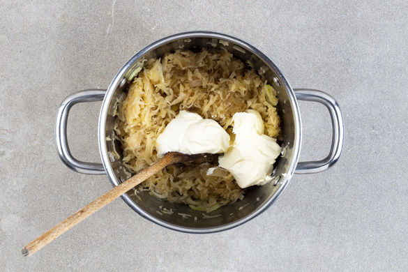 Ca. 1/4 der Zwiebeln in einem mittelgroßen Topf mit 2–3EL Pflanzenöl bei mittlerer Hitze 2–3Min. glasig anbraten. Das Sauerkraut, die Crème fraîche und ca. 1/4 des Brühgewürzes dazugeben und alles gut verrühren. Das Sauerkraut einmal aufkochen lassen und mit Salz und Pfeffer abschmecken. Bis zum Servieren warm halten.