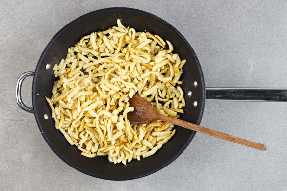 Die Spätzle in einer zweiten großen Pfanne mit 1–2EL Butter bei mittlerer Hitze 3–4Min. anbraten. Den Rostbraten mit dem Sauerkraut, den Spätzle und der Zwiebelsauce anrichten und servieren.