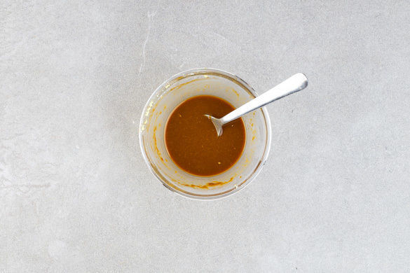 Den Ingwer schälen und fein reiben. Die Misopaste, die Sojasauce und 2TL Zucker mit dem Ingwer verrühren. Das Geschnetzelte mit etwas Küchenkrepp trocken tupfen, mit der 1/2 der Würzsauce vermengen und beiseitestellen.