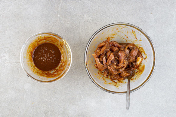 Das Fleisch samt Würzsauce in derselben Pfanne mit 1EL Pflanzenöl bei mittlerer bis starker Hitze 5–6Min. von allen Seiten anbraten, bis das Fleisch durch ist.