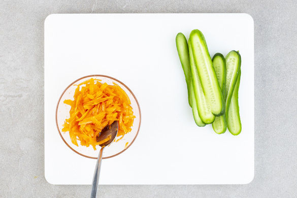 Die Sweet-Chili-Sauce mit 2–3EL Wasser verrühren. Die Gurke längs in schmale Streifen schneiden. Die Karotte schälen und grob reiben, dann mit der Sweet-Chili-Sauce mischen.