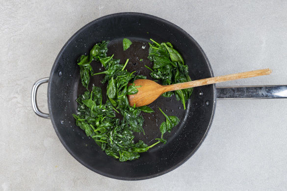 Den Knoblauch schälen und fein würfeln oder reiben. 1 Handvoll Spinat in einer mittelgroßen Pfanne mit 1EL Pflanzenöl bei mittlerer Hitze zusammenfallen lassen. Den Knoblauch hinzugeben, dann den restlichen Spinat untermischen. Mit Salz und Pfeffer würzen, aus der Pfanne nehmen und beiseitestellen.