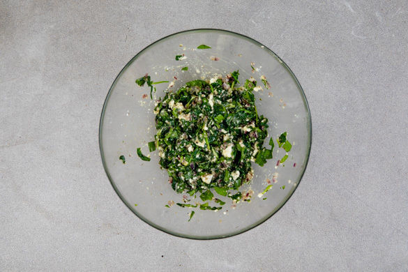 Die Zwiebeln in einer mittelgroße Pfanne mit 1EL Olivenöl bei mittlerer Hitze 2–3Min. darin glasig anbraten. Den Knoblauch und Gewürzmischung nach Geschmack hinzugeben und 1Min. mitbraten. Den gehackten Spinat zugeben und zusammenfallen lassen. Die Füllung aus der Pfanne nehmen und etwas abkühlen lassen, dann den Feta und 1 Ei untermengen und mit Salz und Pfeffer würzen.