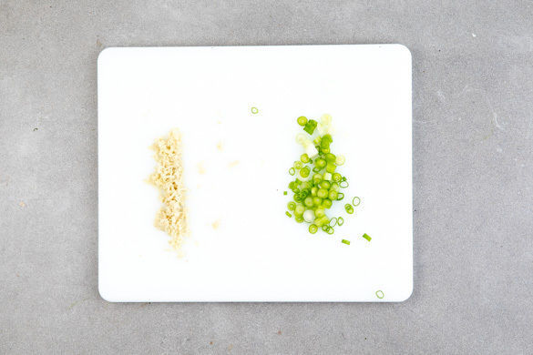 Den Ingwer schälen und fein reiben. Die Lauchzwiebeln in feine Ringe schneiden.