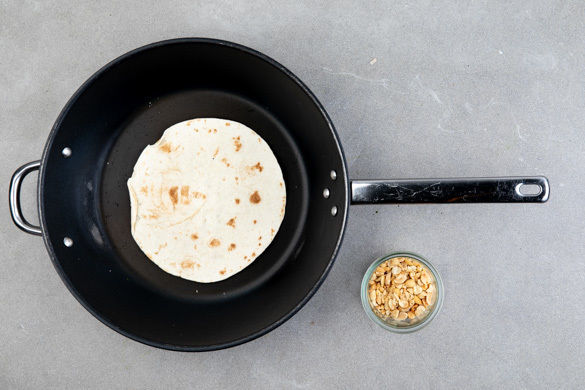 Die Erdnüsse grob hacken. Die Tortillas in einer zweiten mittelgroßen Pfanne nacheinander bei mittlerer Hitze auf jeder Seite ca. 30Sek. erwärmen. Die warmen Tortillas mit dem Salat und der Jackfruchtsauce füllen und die Wraps mit den Erdnüssen garniert servieren.