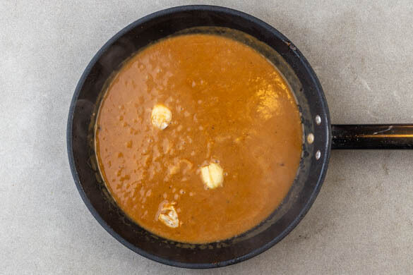 Die Pfanne vom Herd nehmen und die Hitze auf die niedrigste Stufe reduzieren. 2EL kalte Butter und den Knoblauch in die Pfanne geben und die Pfanne zurück auf den Herd stellen. Das Fleisch auf jeder Seite weitere 1–2Min. braten, dabei mit einem Löffel kontinuierlich Bratfett über das Fleisch. Das Fleisch bis zum Servieren abgedeckt auf einem Teller ruhen lassen.
