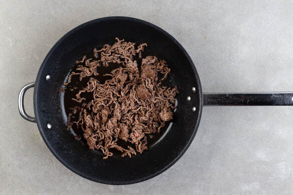 Das Hack zurück in die Pfanne geben, dann den Knoblauch, das Tomatenmark, das Gulaschgewürz, das Brühgewürz und ½TL Salz hinzufügen. 1EL Mehl einrühren und langsam das Kochwasser angießen, dabei stetig rühren. Die Hack-Füllung bei mittlerer Hitze 3–5Min. einköcheln lassen.