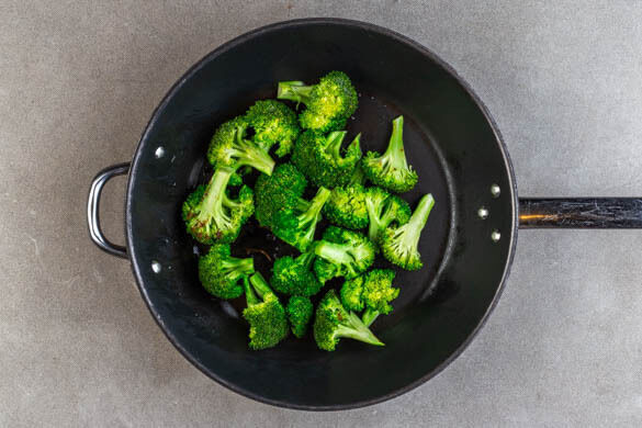 Den Brokkoli in Röschen zerteilen, den Strunk ggf. schälen und in fingerdicke Stifte schneiden. Den Brokkoli in einer großen Pfanne mit 2EL Pflanzenöl bei starker Hitze in 2–3Min. leicht bräunlich anbraten. 5–6EL Wasser zugeben und den Brokkoli abgedeckt bei mittlerer bis starker Hitze 5–6Min. garen. Mit der Sojasauce würzen und aus der Pfanne nehmen. Die Pfanne aufbewahren.