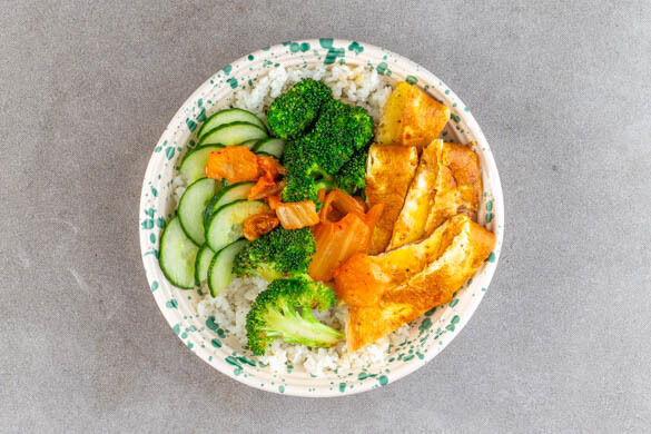 Kimchi geht immer! Heute wird die pikante koreanische Köstlichkeit mit Eiern zu einem raffinierten Omelett vereint und mit würzigem Brokkoli und erfrischender Gurke auf einem himmlischen Reisbett serviert. Zum Schluss kommt noch etwas geröstetes Sesamöl zum Einsatz – fertig! Einfach ein Traum.