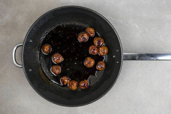 Die Hackbällchen in einer großen Pfanne mit 2EL Pflanzenöl bei mittlerer Hitze 5–8Min. rundum braten, bis sie goldbraun und fast gar sind. Die Teriyakisauce dazugeben und unter Rühren kurz eindicken lassen, bis alle Hackbällchen mit einer sämigen Sauce bedeckt und gar sind. Mit Salz und Pfeffer abschmecken und bis zum Servieren warm halten.