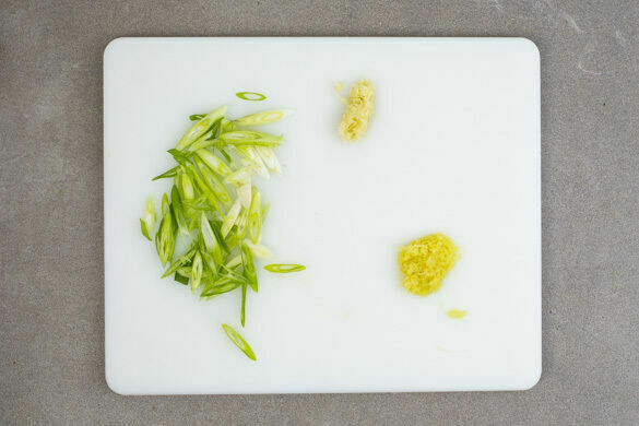 In einem großen Topf ausreichend gesalzenes Wasser für die Nudeln zum Kochen bringen. Den Knoblauch schälen und fein würfeln. Die ½ des Ingwers schälen und fein reiben. Tipp: Wer mag, kann auch mehr Ingwer verwenden oder nutzt den restlichen Ingwer zum Aufbrühen eines Tees. Die Lauchzwiebeln schräg in feine Ringe schneiden.