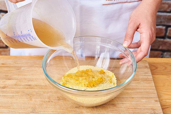 Das Brühgewürz in 600ml heißem Wasser auflösen. Ca. 2TL Orangenschale fein abreiben, dann die Orange halbieren und auspressen. Den Couscous in einer Schüssel mit dem Orangensaft und 500ml Brühe verrühren und abgedeckt 6–8Min. ziehen lassen, anschließend mit einer Gabel auflockern.