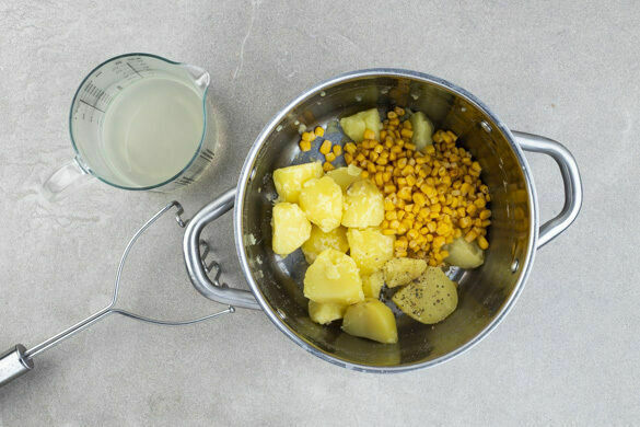 Die Kartoffeln zurück in den Topf geben und zu einem cremigen Püree stampfen, dabei nach Bedarf etwas Kochwasser hinzugeben. Tipp: Wer mag, kann noch 1EL Margarine hinzufügen. Den Mais abgießen, untermengen und das Püree mit Salz und Pfeffer abschmecken.