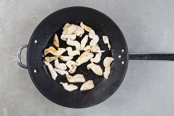 Das Fleisch mit etwas Küchenkrepp trocken tupfen und in dünne Streifen schneiden. In einer großen Pfanne mit 1EL Olivenöl bei starker Hitze 2–3Min. scharf anbraten und mit Salz und Pfeffer würzen.