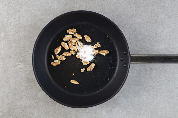 In einem mittelgroßen Topf ausreichend gesalzenes Wasser für die Pasta zum Kochen bringen. Die Walnüsse halbieren und in einer kleinen Pfanne ohne Zugabe von Fett bei mittlerer Hitze 2–3Min. anrösten. 1 gestrichenen EL Zucker dazugeben und die Nüsse vorsichtig karamellisieren lassen, bis der Zucker anfängt, flüssig zu werden. Auf einem Teller beiseitestellen.
