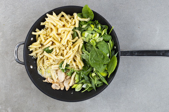 Käse-Liebhaber aufgepasst: Hier wird nicht gekleckert, sondern geklotzt! Die sahnige Sauce aus Crème fraîche und köstlichstem Blauschimmelkäse umschmiegt die feine Pasta. Babyspinat und Lauch steuern gemüsiges Aroma bei, das kurzgebratene Hähnchenfleisch bleibt wunderbar zart. Zum Schluss noch schwungvoll mit karamellisierten Walnüssen und geriebenem Käse garnieren, und dann gibt es wirklich kein Halten mehr!