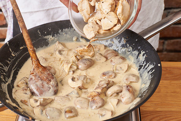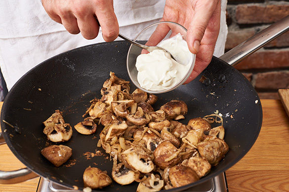 Die Hitze reduzieren, 1EL Mehl zu den Pilzen geben und unterrühren. Die Crème fraîche hinzufügen und ca. 1Min. sanft mitköcheln lassen, dann die Brühe angießen. Die Sauce mit dem Senf, Salz und Pfeffer abschmecken und noch 2–3Min. leicht einköcheln lassen.