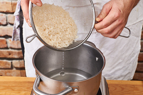 In einem mittelgroßen Topf 300ml leicht gesalzenes Wasser zum Kochen bringen. Den Reis in einem Sieb unter fließendem Wasser abspülen, bis das Wasser klar bleibt. Sobald das Wasser kocht, den Reis auf niedrigster Stufe abgedeckt 10–12Min. kochen, bis das Wasser aufgesogen und der Reis gar ist. Noch ca. 5Min. ohne Hitzezufuhr abgedeckt ziehen lassen.