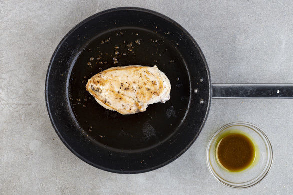 Das Fleisch mit etwas Küchenkrepp trocken tupfen und mit Salz und Pfeffer würzen. In einer mittelgroßen Pfanne mit 1EL Olivenöl bei starker Hitze auf jeder Seite ca. 1Min. scharf anbraten. Das Currypulver sowie 1 Prise Salz und Pfeffer mit 2–3EL Olivenöl verrühren.
