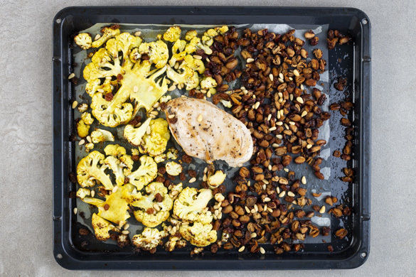 Ein köstlicher Mix aus Farben und Texturen erwartet dich heute! Der Clou: Alles wird auf einem Backblech geschichtet und gebacken – Blumenkohl und Borlottibohnen, saftiges Hähnchenfleisch, Rosinen und Pinienkerne. Ein würziges Curryöl vereint die Aromen, dazu gibt es noch eine Tahinisauce mit Ingwer sowie frische Petersilie.