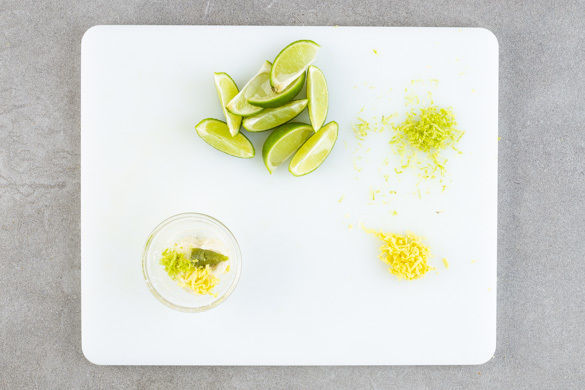 Den Ingwer schälen und fein reiben oder sehr fein würfeln. Die 1/2 der Limettenschale abreiben, dann die Limette in Spalten schneiden. Die 1/2 der Wasabipaste mit der Mayonnaise glatt rühren, dann ca. 1/3 des Ingwers und 1–2TL Limettenabrieb unterrühren. Tipp: Wer es scharf mag, kann auch die ganze Wasabipaste verwenden.