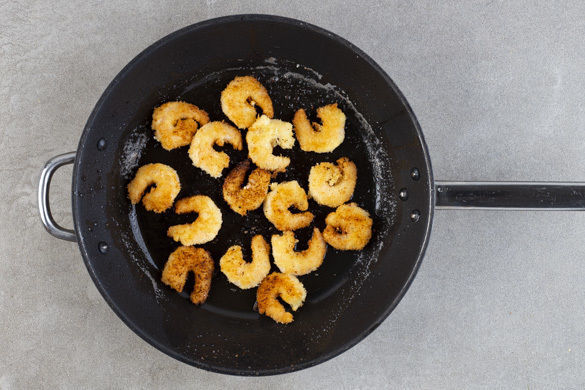 Die Garnelen mit etwas Küchenkrepp trocken tupfen und leicht salzen. 1 Ei verquirlen und die Garnelen zuerst in 1–2EL Mehl wenden, dann durch das Ei ziehen und anschließend in den Kokosraspeln wälzen.