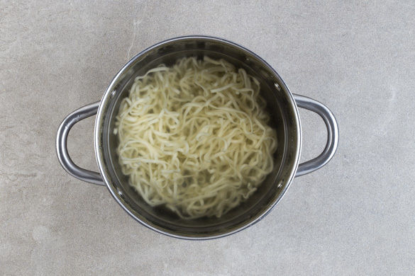 In einem mittelgroßen Topf ausreichend gesalzenes Wasser für die Nudeln zum Kochen bringen. Die Nudeln in das kochende Wasser geben und ca. 3Min. köcheln lassen, dann den Topf vom Herd nehmen und die Nudeln 7–8Min. ziehen lassen. Mit einem Messbecher ca. 150ml Nudelwasser abschöpfen, dann in ein Sieb abgießen und abtropfen lassen.