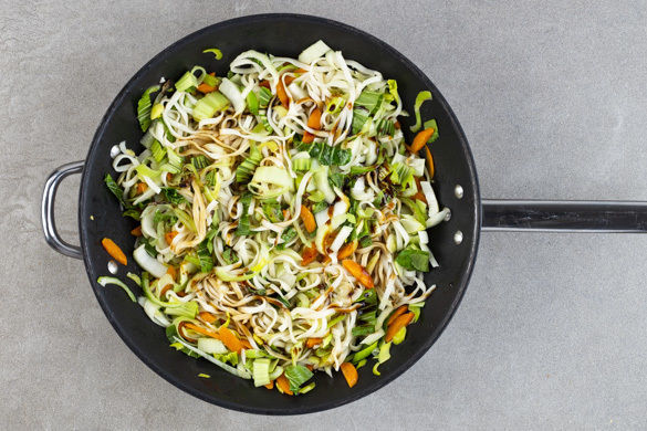 Die Karotten, den Lauch und den restlichen Ingwer in einer großen Pfanne mit 1–2EL Pflanzenöl bei starker Hitze 3–4Min. scharf anbraten. Mit der Teryakisauce, der Sojasauce und 150–200ml Nudelwasser ablöschen, dann die Nudeln und den Pak Choi untermengen. Mit Salz und Pfeffer würzen.